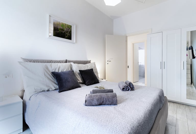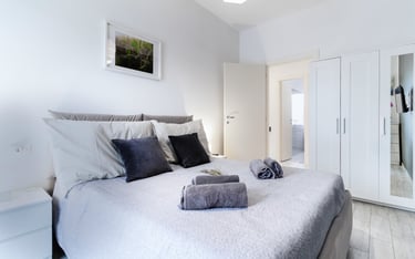Comfortable double bedroom, designed to ensure relaxation and privacy, with a large and practical double storage bed, chests of drawers, spacious wardrobe, and 32” Smart TV. The room is completed by a private balcony overlooking the quiet inner courtyard, perfect for enjoying peaceful moments.