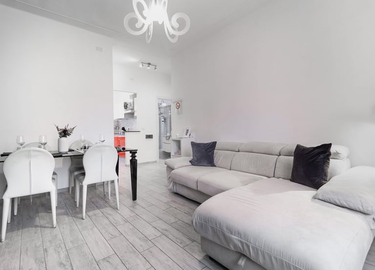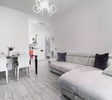 Spacious and bright living room, designed to offer maximum comfort, with a comfortable sofa bed, versatile dining table, 50” Smart TV for relaxing moments, and free high-speed Wi-Fi, perfect both for leisure and remote working.