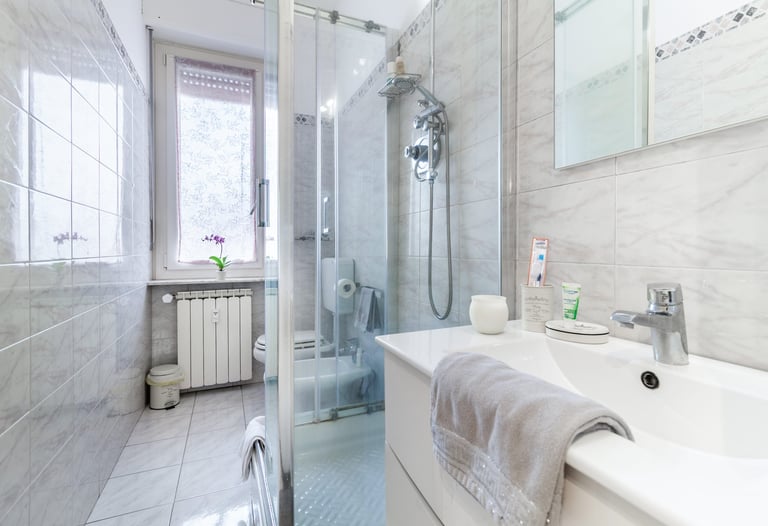 Functional and well-organized bathroom, complete with shower box and sanitary fittings, designed to offer comfort and practicality throughout your stay.